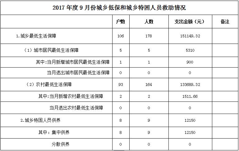 2017年度9月份城乡低保和城乡特困人员救助情况